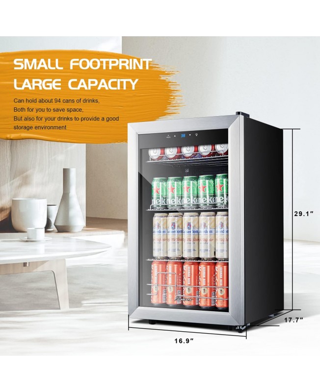 - ★LARGE CAPACITY FOR WINE & CAN: This mini wine fridge holds up to 108 cans of your favorite drink in different sizes. It's the perfect choice for you. Soft white LED lights keep your drink in a beautiful environment, help you select your favorite drink at all times.